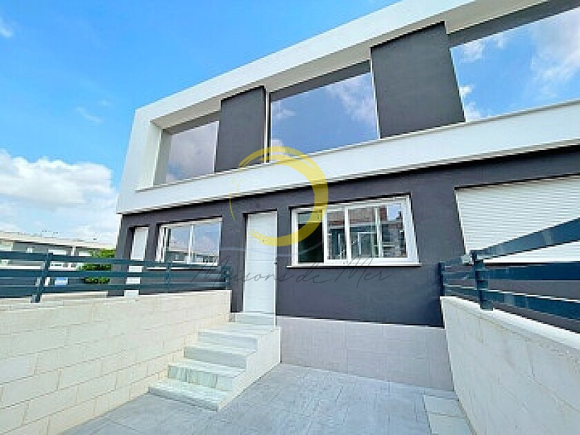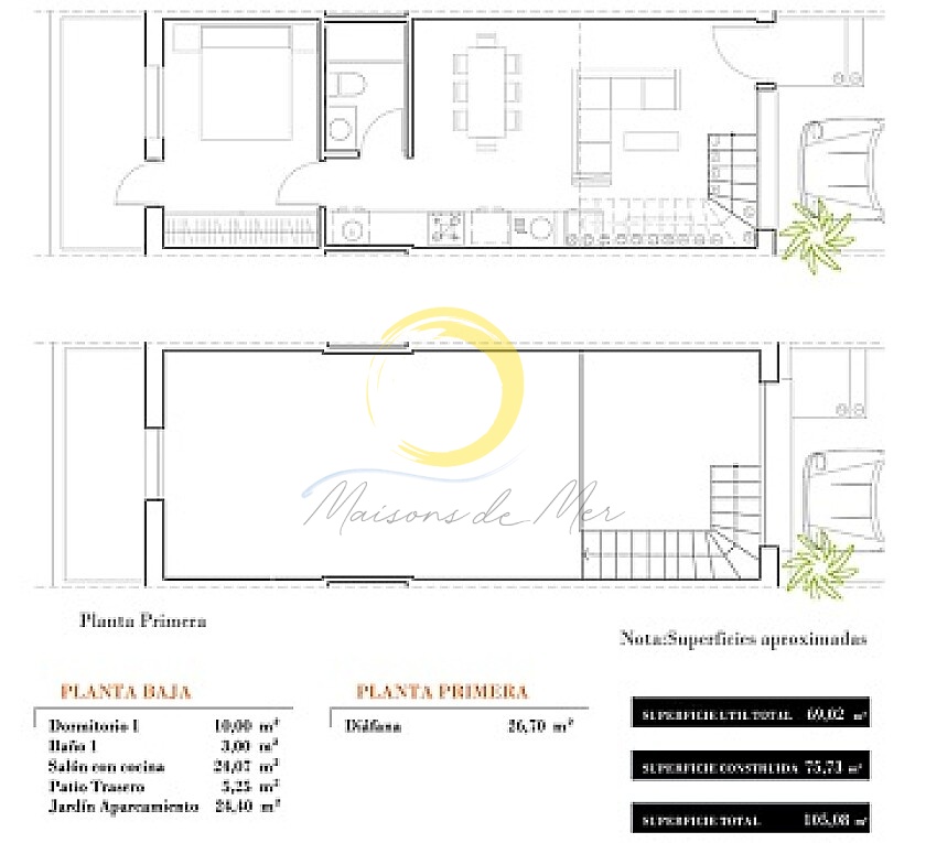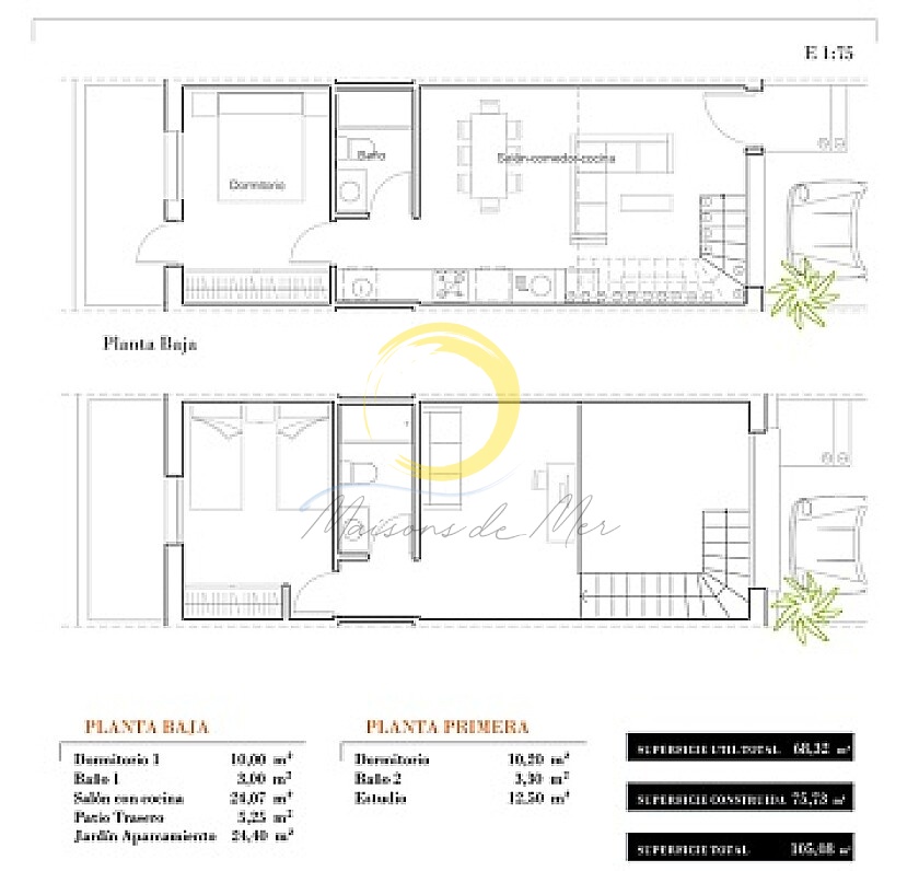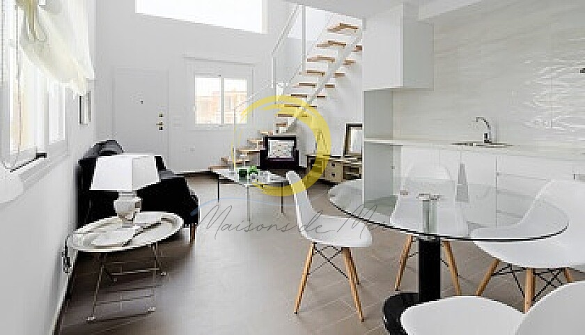Maisons de ville sur plan avec 1, 2 ou 3 chambres avec 1 ou 2 salles de bains, à construire sur deux étages, avec jardin privé à l'avant et patio à l'arrière, grands jardins communautaires avec piscine.